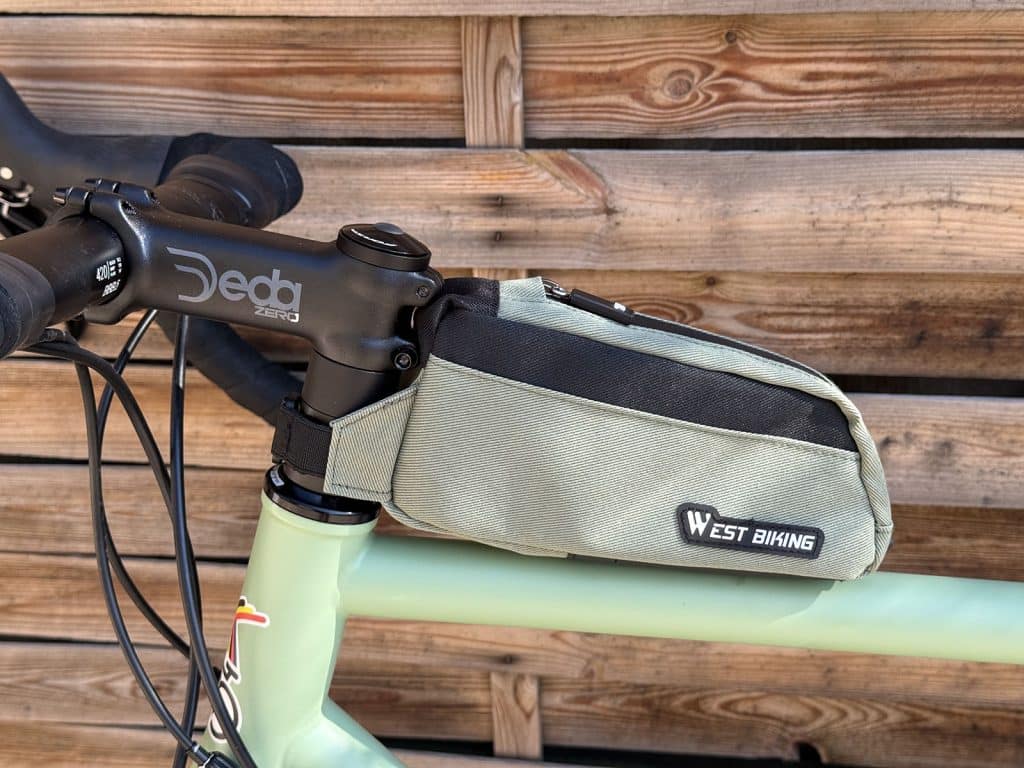 A kormányszár mögé rögzített kis táska az apróságoknak (telefon, energiaszelet).